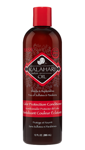 Hask Kalahari Melon Oil Colour Protection Conditioner 355ml Preserve and nurture color treated hair with HASK Kalahari Melon Oil Color Protection Conditioner. Found in the African desert, Kalahari melon oil is known to thrive and retain moisture in the driest conditions. This natural color-locking, damage-blocking powerhouse ingredient counteracts dry-out and fading, leaving hair nourished and shiny. With Color Shield Complex, cranberry and sunflower oils, this conditioner softens, detangles and helps maintain long-lasting vibrant color.