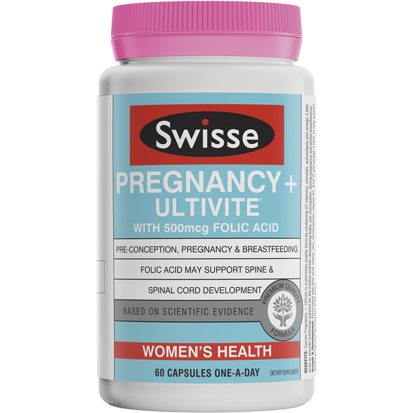 Swisse Pregnancy+ Ultivite is a premium quality formula to provide nutritional support for the mother and her developing baby, during preconception, pregnancy and breastfeeding.