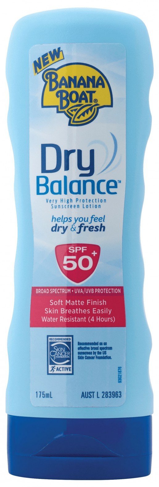 New lightweight Banana Boat® Dry Balance™ Very High Protection Sunscreen Lotion SPF 50+ lets you have fun in the sun without feeling greasy or sticky. The formula combines broad spectrum UVA/UVB protection that draws away excess moisture and oil, leaves a soft matte finish, and lets skin breathe – so your skin feels fresh, dry and comfortable.