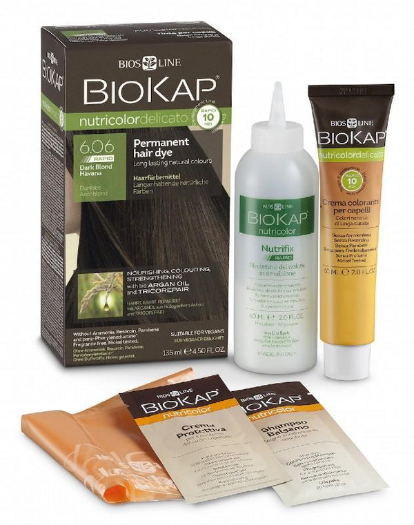 Formulation with no Para-Phenylenediamines. The exclusive formula of Biokap nutricolor delicato Rapid permanent hair dye, with vegetable ingredients and high skin tolerability, nourishes and repairs hair while dyeing it and covers grey hair perfectly. The rapid formulation ensures maximum coverage in just 10 minutes due to its high concentration of pigment.