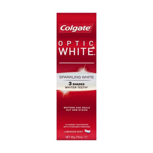 Colgate Optic White Sparkling White whitening toothpaste delivers 3 shades whiter teeth^ and seals out new stains. It is the only toothpaste with the whitening ingredient dentists use* to remove surface and deeply set-in stains. With regular use, it removes stains ordinary toothpastes don't. The must have toothpaste for your daily beauty regime, this whitening toothpaste contains all the benefits of a regular daily use toothpaste plus a whiter, brighter, bolder smile.
