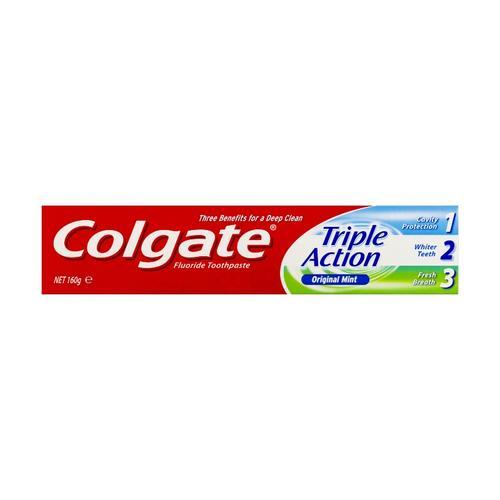 Fluoride is our greatest defence against tooth decay. By helping to replace the essential minerals that plaque acids erode from the enamel, Colgate Triple Action fluoride toothpaste strengthens teeth and helps prevent the decay that may lead to cavities. It also helps to remove surface stains, while the bold mint flavour leaves breath fresh after brushing.