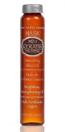 Hask Keratin Oil Smoothing Shine Oil 18ml Give damaged, over-processed hair a miracle makeover with HASK Keratin Protein Smoothing SHINE® Oil. This lightweight, alcohol-free instantly absorbing oil provides a gorgeous shine with no oily residue. Infused with hydrolyzed keratin to smooth and reduce frizz, this oil penetrates hair to leave frizzy, dry hair soft, smooth and incredibly shiny. The delicious scent will invigorate your senses.