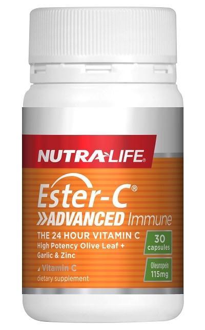 Nutralife Ester C Advanced Immune Capsules The 24 hour Vitamin C combined with high potency Olive Leaf plus Garlic and Zinc for powerful immune support this winter. Beneficial for: Combines Ester-C® with high potency Olive Leaf plus Garlic and Zinc Provides 24 hour immune support Is stomach friendly and rapidly absorbed May help reduce the duration and severity of colds and flu symptoms